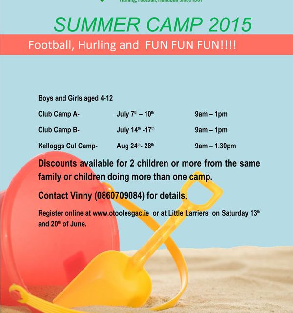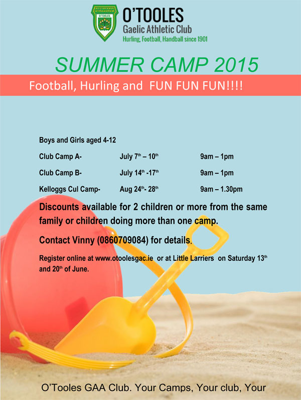 O’Tooles GAC are hosting Three Summer Camps.. You do not have to be an O’Tooles player, everyone is welcome. So come along and join in the fun this Summer. The Summer Camps will take place in O’Tooles GAC on Blunden Drive.