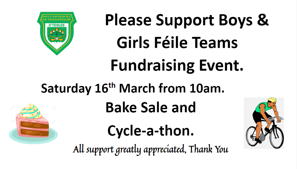 Please Support Boys & Girls Féile Teams Fundraising Event. Saturday 16th March from 10am. Bake Sale and Cycle-a-thon.